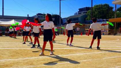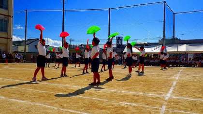 はじめは、体を大きく使ってダンスを踊り、途中からは、ピンクと黄緑のあざやかな扇子をもって踊りました。ウエーブのような振付や、千手観音のようなポーズなど、子どもたちはとても生き生きとした姿で、華やかな演技でした。