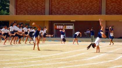 はじめの「ダンス」では、アップテンポな曲に合わせて難しい振付を次々と披露しました。代表の児童の側転の見事でした。