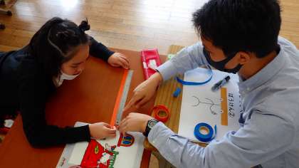 算数では、長さの学習をしています。およそ30cmと見当をつけて切ったテープの長さが何cmあるかを定規で正確に測っています。