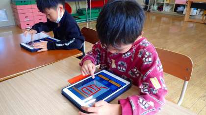 国語では、iPadのアプリケーションを使って、筆順を確かめながら漢字を書く学習をしています。