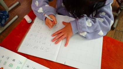 絵を手掛かりに、どんな漢字かを考えて文を完成させます。「はね」や「はらい」、「止め」を意識して、ていねいに書くことができています。