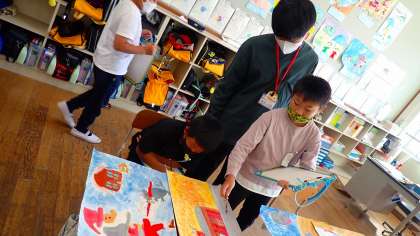 友だちの作品の「色づかい」や「筆づかい」、「細かさ」などを見て、その作品のよいと思ったところを書いています。同じものを描いても、人によって表現はさまざまであることに気付いているようでした。