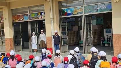 出発式では、校長先生のあいさつ、代表の児童の言葉や担当の先生からのお話がありました。担当の先生からは、「グループの友達とたくさん話し、素敵なところをいっぱい見つけよう。」「見通しをもって、進んで行動しよう。」というお話がありました。乾隆小学校の育成をめざす資質・能力は「対話力」と「主体性」ですが、今日の遠足でもそんな素敵な姿が見られるとうれしいです。