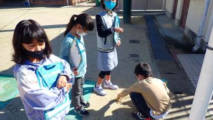 同じ地面でも、太陽が当たっている日なたと日かげではどんな違いがあるのか、予想を立てて調べる活動をしました。あたたかさだけでなく、しめり具合にも違いがあることに気付きました。