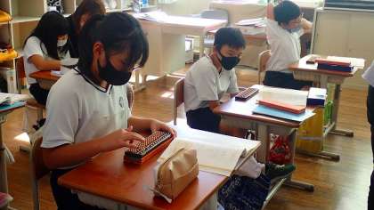 4年生は、算数の「そろばん」の学習をしています。3年生の時にも少し学習しましたが、それを思い出しながら計算をしています。小数でも、整数と同じようにたし算やひき算ができることを確かめました。