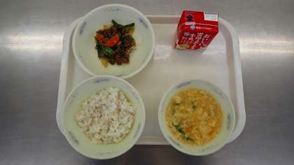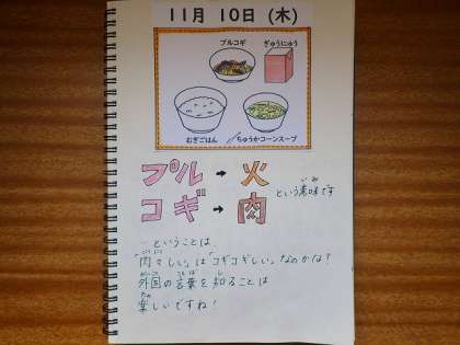 「プルコギ」は、韓国・朝鮮の料理です。「プル」は火、「コギ」は肉の意味で、醤油ベースで甘口の下味をつけた薄切りの牛肉を、野菜や春雨と共に焼いたり煮たりしてつくるそうです。給食では、にんにくやさとう、濃口しょうゆなどで味付けした牛肉を、たまねぎ、にんじん、まいたけ、ニラなどと一緒にいただきました。野菜やまいたけが苦手な子どもたちも、牛肉と一緒においしくいただきました。