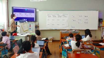 ロイロノートスクールを使って、リズムパターンを組み合わせ、くり返しのある「おまつりのリズム」をつくりました。「ドンドン・ドンドコ…」とリズムを口ずさみながら、手拍子で打って楽しんでいます。最後に、テレビを使ってみんなのリズムを見合って交流しました。