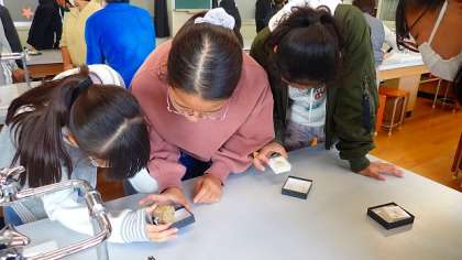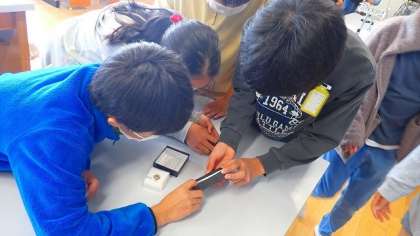 今日は、化石の標本を観察しました。化石の実物を手に取ってみることで、昔の生物の痕跡がこのように残っていることの不思議さを感じているようでした。「もっと見ていたい!」という声も聞かれました。