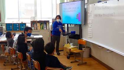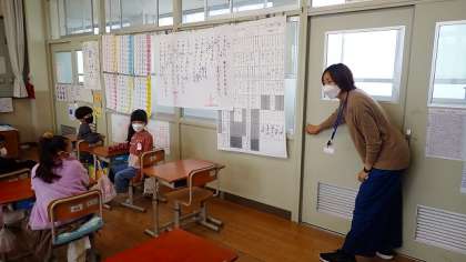はじめに教室では、学校には来校者に応対し、不法に侵入させないようにしていることや、万一の事態の際の合言葉を決めていることなどを確かめました。また、そのような場合の身の守り方や避難の仕方についても確かめました。