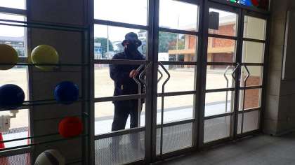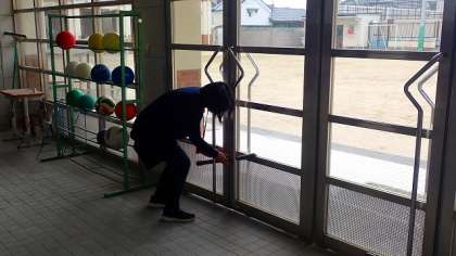 不審者(警察官)が校内に無断で侵入したことを受け、校舎内への侵入を阻止するために昇降口や窓を施錠します。また、児童は緊急の放送を受けて、教室での避難を行いました。