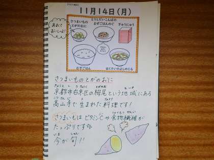 「とりとだいこん葉のまぜごはん」は、味付けをしたやわらかいささみとだいこん葉を、ごはんに混ぜて一緒に食べます。ごはんに混ぜたときにちょうどよいくらいの味付けで、とてもおいしくいただくことができました。「さつまいもの栂尾煮」は、スチームコンベクションオーブンを使って調理しています。さつまいものもっている甘さがよく出ており、甘いお汁と一緒においしくいただきました。