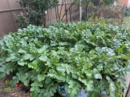 すくすく育っている大根。よく見てみると、土の中から白い大根らしきものが!!土の中でもどんどん育っていることが感じられます。