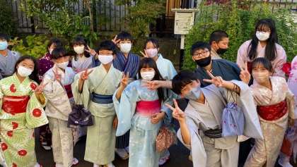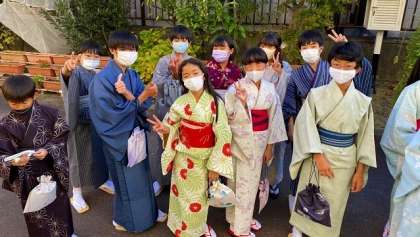 その後、学校のまわりを街歩きしました。普段着ることのない着物を着て、みんなとても楽しそうにしていました。