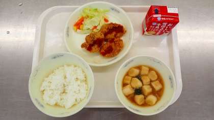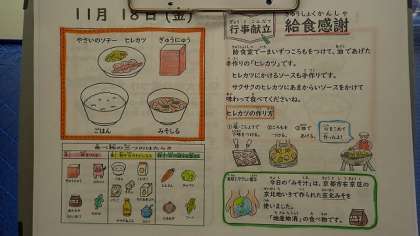 今日は、子どもたちの大好きな「ヒレカツ」です!朝から楽しみにしていた子どももたくさんいたようです。給食調理員さんが、一つ一つていねいに衣をつけて、油で揚げてつくってくださいました。普通のお母さんの何年分ものヒレカツを1日で揚げてくださる2人の調理員さんの愛情がたっぷり詰まったヒレカツを、お腹いっぱいいただきました。