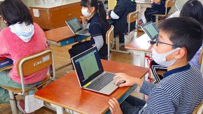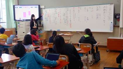 ロイロノート・スクールを活用して、主語と述語の間に修飾語を加えていきます。みんなで交流すると、「山田君は、姫を 守った。」や、「山田君は、ルールを 守った。」などいろいろな文が出てきました。中には、いくつかの修飾語を組み合わせる子もいました。