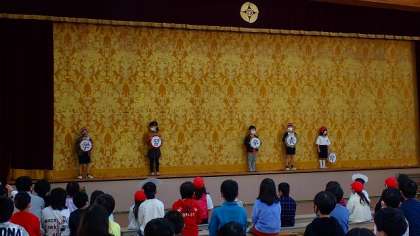 最初に、校長先生からのお話を聞き、次に、1年生の「はじめの言葉」です。代表の5名の子どもたちが、がんばってくれました。