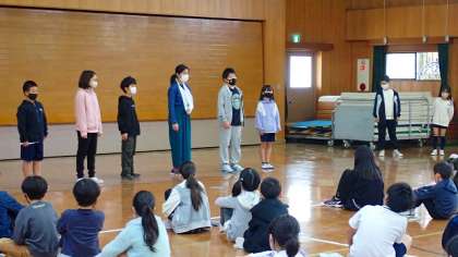 今日のたてわりタイムでは、「友だち」をテーマに書かれた詩を読み、感じたことをグループで交流します。はじめに、児童会の担当の子どもたちから説明がありました。