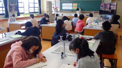 前の時間に行った、水にとけるものの量を増やす実験について、結果をまとめ、そこからわかることを話し合いました。