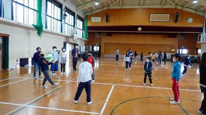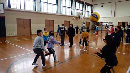 3年生も、4年生と同じソフトバレーボールを使ってパスに挑戦します。いちばんたくさんパスを繋ぐことができたグループは、11回連続でパスを繋ぐことができました。