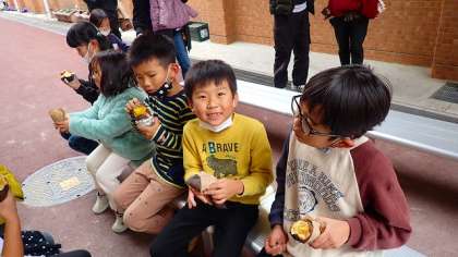 できたて、ほくほくのおいしい焼いもをいただきました。とてもいいにおいが漂っています。サツマイモの甘さがよく出ており、みんなおいしくいただきました。