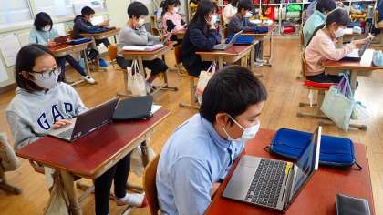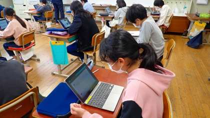今年度も、GIGA端末を使って問題に回答します。小学生向けの「ジュニア」京都検定とはいえ、難しい問題もたくさんあります。「う〜ん」と頭をひねりながら、最後まで一生懸命考えていました。
