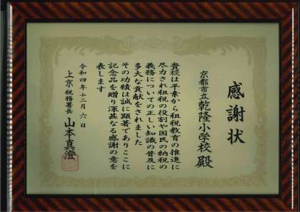6年生が参加してきた租税教室やハロータックスクイズなどを通して租税教育を進めてきたことについて、上京税務署長様より感謝状をいただきました。