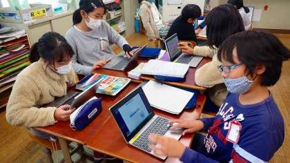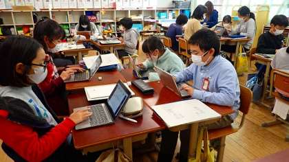 学習を進めてわかってきた、食を取り巻く現状や課題について、どのような対策をすることができるのか、何を訴えることが必要かについてグループで考えをまとめています。ロイロノート・スクールの共有ノートを使ってプレゼンテーション資料づくりをしているところです。