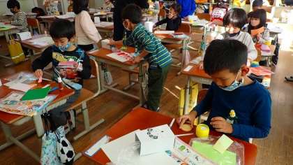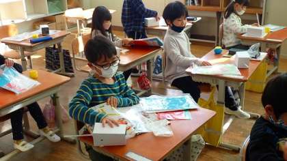 ビニル袋や箱に、色紙や画用紙を使って飾りをつけていきました。すてきな作品ができあがるのが楽しみです。