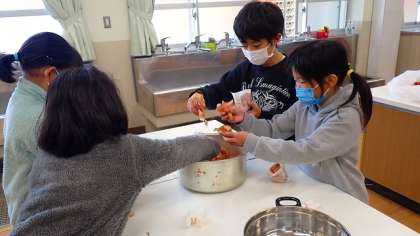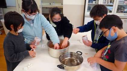 今日は、普段捨てているものを活用して何かをつくり出すことができないかというテーマで、たまねぎの皮を使って染物づくりをしました。はじめに、大量のたまねぎの皮をていねいにお茶パックに詰めていきます。