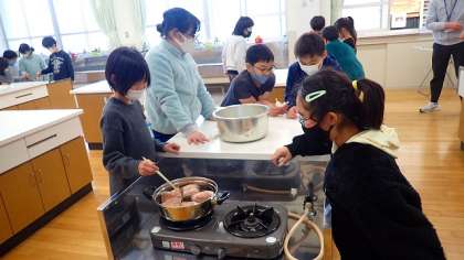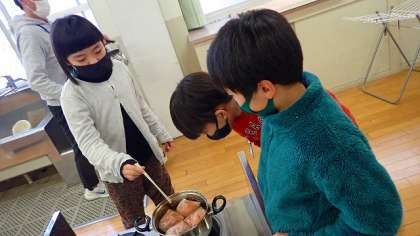次に、たまねぎの皮を煮出していきます。だんだんと、お鍋の中のお湯の色が黄色く染まっていきます。そして、お鍋の中に輪ゴムで絞っておいたガーゼハンカチを入れます。そのまましばらく待つと…。