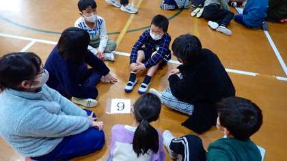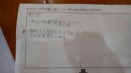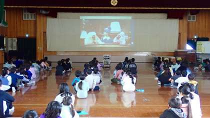 体育館に集まって、全校のみんなでビデオを見ました。そして、ビデオを見て考えたことをたてわりグループの友達同士で交流しました。
