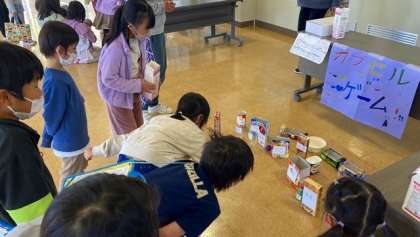 生活科の「あそんで ためして くふうして」の学習で考えた遊びを、幼稚園のみなさんにも楽しんでもらうために企画しました。はじめの会の後、遊びタイムのスタートです。前後半それぞれ3つずつ、全部で6つのお店を開きました。