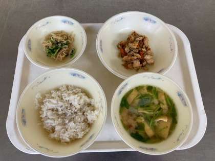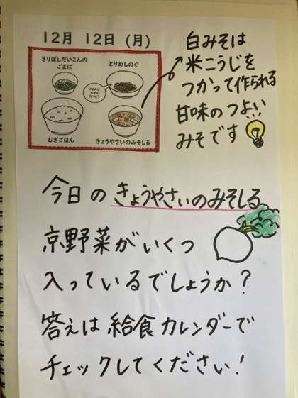 「とりめしの具」は、鶏肉のほか、にんじん、ごぼう、干しいたけなどたくさん具が入った食べ応えたっぷりの献立です。ごはんに混ぜて、おいしくいただきました。「京野菜のみそ汁」は、「金時にんじん」や「聖護院だいこん」など、京都ならではの京野菜がたっぷり入ったおみそ汁です。いつものみそ汁との違いを感じながらいただきました。