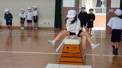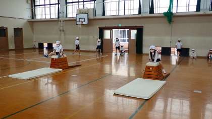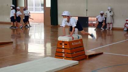 1年生は、体育の「とびばこあそび」の学習をしています。