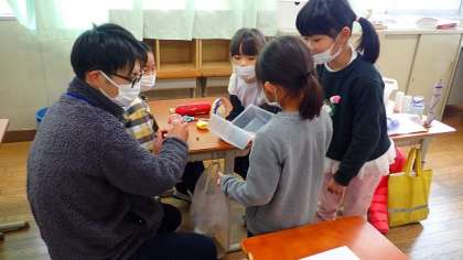 たくさん見つけたどんぐりや松ぼっくりなどを使って、楽しく遊べるおもちゃづくりをしています。松ぼっくりのけん玉や、どんぐりのマラカスなどを作っています。様子を見ていると、できたおもちゃの遊び方を教えてくれました。
