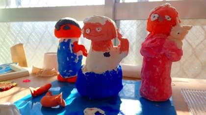 窓際には、かわいい人形が置かれています。2月の「小さな巨匠展」で展示する、合同作品用の人形です。できあがってみんなの作品を並べるのが楽しみです。