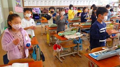 鍵盤ハーモニカ、カスタネット、すず、タンブリンで、「山のポルカ」の合奏をしました。リズムに気をつけて演奏して、いろいろなパートの音の重なりを楽しむことができました。
