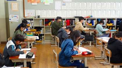 6年生にとっては、小学校で最後のジョイントプログラムの確認テストです。小学校でこれまでに学習したことがしっかり身に付いているかを確かめる機会です。落ち着いて問題を読み、あきらめずに問題に取り組んでいました。