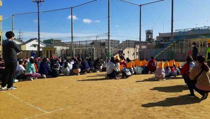 運動場では、校長先生から今日の避難訓練についてのふり返りと、実際に地震が起こった場合に備えておくことの大切さについてお話をしていただきました。
