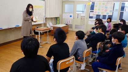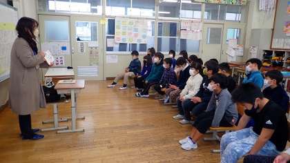3・4年生の子どもたちは、とても静かに読み聞かせを聞いていました。コスモス学級の子どもたちは、お話に興味津々で、身を乗り出して絵を見に行っていました。