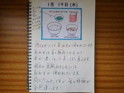 今日の「肉じゃが」に使われているみそは、「赤みそ」です。「赤みそ」は長時間熟成させるので、色が濃くなって赤っぽく見えます。コクのあるみその味と。トウバンジャンのピリッとした辛みの相性がよく、ごはんとよく合う献立でした。