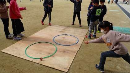 「けん玉」コーナーの様子です。膝をうまく使ってするのがけん玉のコツですが、上手くお皿に乗せることができたでしょうか。