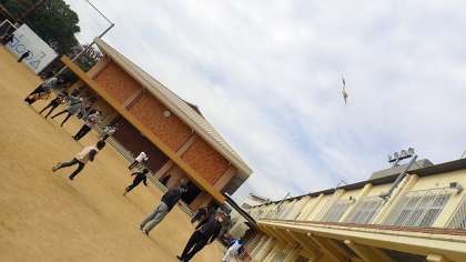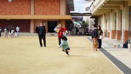 用意してくださった「ゲイラカイト」をあげました。2人組で凧を持つ役とあげる役に分かれ、協力してたこあげをします。風をとらえてたこが高くあがると、子どもたちは歓声を上げていました。