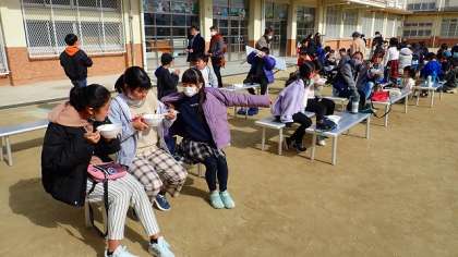 お昼には、楽童くらぶや育友会のみなさんがつくってくださった、豚汁うどんをいただきました。大きな具やしょうがの効いた肉だんごが入っていてとてもおいしく、また、体もあたたまるお昼ごはんでした。みんな「おいしい!」といって食べています。