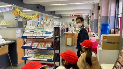 次にお伺いした郵便局では、局長室に入れていただき、局長さんからお話を聞かせていただきました。郵便物が多い日や季節を聞くと、やはり年賀状の時期が一番多いということがわかりました。1日に4万〜4万5000通の郵便物があるそうです。バイクと車で集荷と配達をされていて、バイクは34台あるそうです。最後には窓口を案内していただき、切手やハガキなどの種類も見せていただきました。