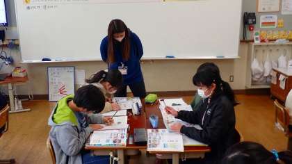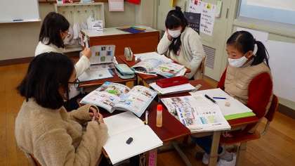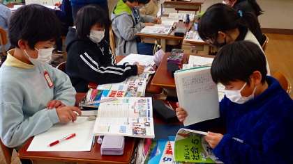 「コンビニエンスストアでは、商品を運ぶために情報をどのように活用しているのだろう。」という学習問題で調べ学習をしています。わかったことをグループの友達と交流していました。