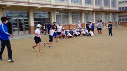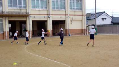 今日が、1時間目の学習でした。子どもたちにとっては、はじめてのラグビーで、「ボールを前に投げてはいけない」「ボールよりも前(相手チームの陣地)でプレーしてはいけない」というルールや、「タグ」を取られたら味方にパスをすることなどを知りました。