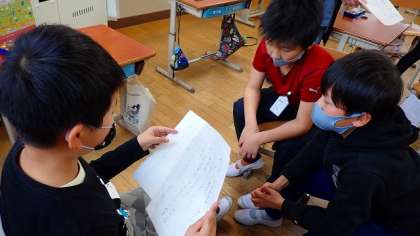 今日は、みんなが書いた物語を読み合う交流会を開きました。自分の書いたものと比べながら、友達の物語を興味をもって聞いていました。物語を聞いた後は、どんなところがよかったかを伝え合っていました。