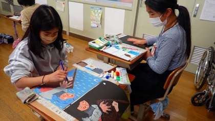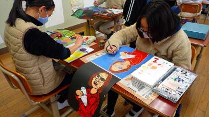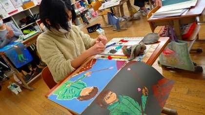 来週の作品展で展示する版画の作品の仕上げに取り組んでいます。絵の具をていねいに塗り、バレンでこすってうつし取っています。子どもたちの力作を、作品展でご覧ください。