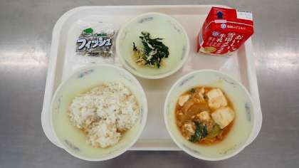 「とうふの四川風」は、トウバンジャンの辛みがピリッと刺激的で、ごはんによく合う献立です。豚肉、とうふ、たまねぎなどたくさんの具材を、おいしくいただきました。「切り干し大根のいためナムル」は、切干大根とほうれん草を、米酢のさっぱりした酸味でおいしくいただきました。